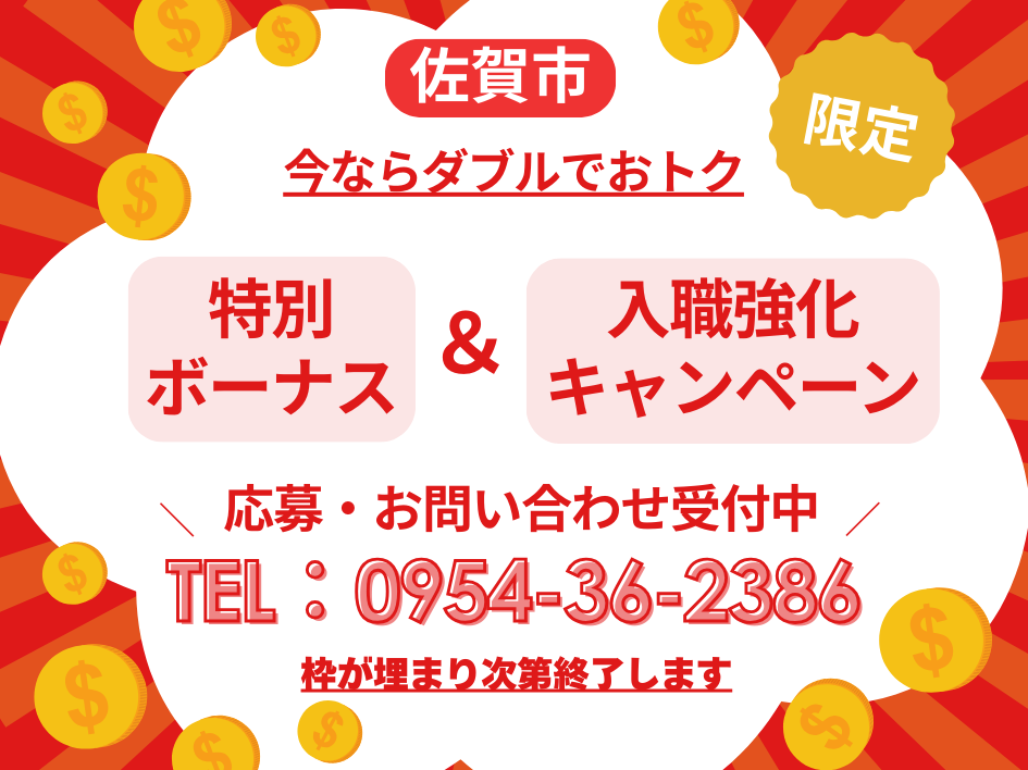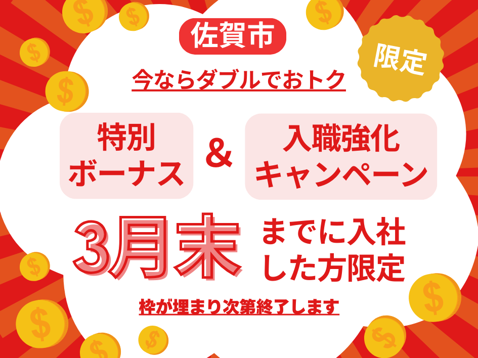 今ならダブルでおトク! ★特別ボーナス最大33万円支給 期間内にご応募いただいて 就業された方に限り、 年間33万円を支給いたします! ※会社規定あり 就業後、 3か月経過すると…3万円 6か月経過すると…3万円 12か月経過すると…5万円支給! さらに特別賞与として、 2026年3月に2万円 2026年9月に10万円 2027年3月に10万円を支給! ★入職強化キャンペーン中 3月末までに入社された方限定で 最長2か月間、時給+150円にて 給与を支給いたします☆ <時給1200円の場合> 通常だと…▼ 1200円×8時間×月20日 =月収192,000円 キャンペーン中だと…▼ 時給1200円→1350円に! 1350円×8時間×月20日 =月収216,000円 実働8時間で20日勤務した場合は、 通常よりも約2万円プラス♪ 枠が埋まり次第終了いたしますので ご応募・お問い合わせはお早めに◎ ※会社規定あり *-*-*-*-*-*-*-*-* (具体的なお仕事内容は…?) 倉庫内で部品の仕分けや ピッキングなどの軽作業をお任せ♪ ◎仕分け作業 入荷してきた部品の バーコードをスキャン! 仕分けして指定の棚に片付け♪ ◎ピッキング作業 製造現場から指示された部品を 棚から見つけ出して、 製造ラインへ供給します。 ・-・ おすすめポイント! ・-・ ◇嬉しい土日祝休み! しっかり休めて気分もリフレッシュ☆ 仕事とプライベートを両立させたい、 そんなあなたにオススメです◎ ◇資格や経験のいらない軽作業! 未経験からでも始められます♪ なにか新しいお仕事をしたい方に ピッタリのお仕事です☆ ◇冷暖房完備で一年中快適! 夏の暑さ・冬の寒さも気にならない◎ 体調を崩しやすい季節の変わり目も、 快適に過ごせる職場環境です♪ ・-・-・-・-・-・-・-・-・ (どんな会社…?) 昭和63年創業の長期安定企業! 半導体製造装置の組立や 部品加工を行っています。 長く安定して働ける環境なので、 社員さんの中には柳川や久留米、 三潴などから通っている方も♪ (当社で働いている年代や性別は?) 男性:女性=5:5 幅広い年齢層の方が働いています! 20代~40代前半の方が多数活躍中☆ (多方面から通勤可能!) ◇モラージュ佐賀から車で約10分 ◇吉野ヶ里歴史公園から車で約20分 ◇ゆめタウン大川から車で約20分 ◇佐賀県立森林公園から車で約30分 嘉瀬町・吉野ヶ里町・大川市など 多方面から通勤可能な好立地です◎ 事前の職場見学ができます! 興味のある方はお気軽にご応募ください♪ ※電話での応募・問い合わせ受付中! TEL:0954-36-2386 |