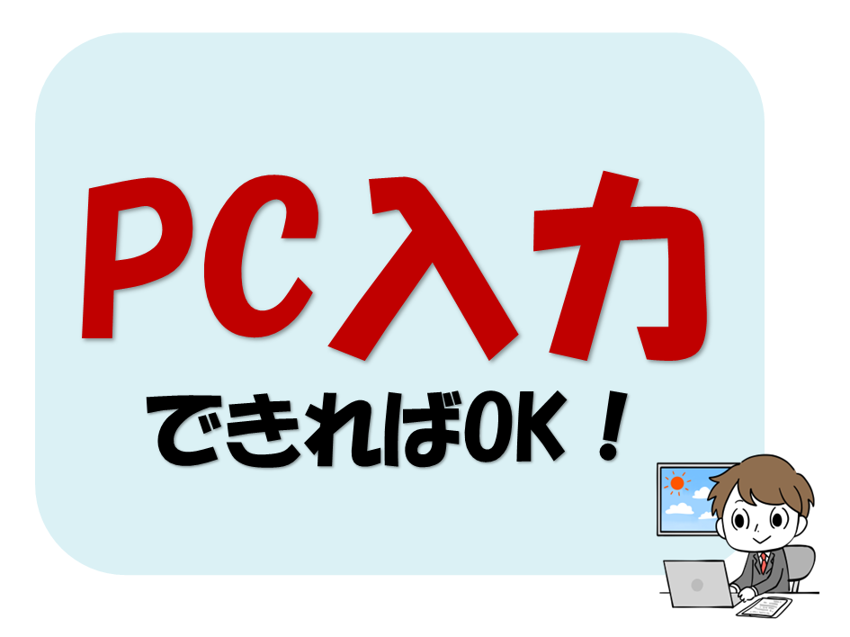 (Excel・Wordでの入力など)が スムーズに出来る程度のPCスキル必須 ※関数などは使用しません お気軽にお問い合わせください♪ |