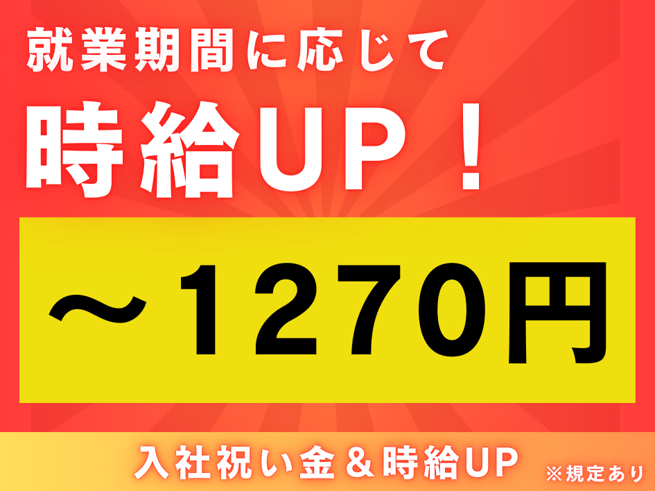 ・交通費実費相当支給 ・就業期間に応じて時給UP! ※4か月以降は高時給1270円♪ 残業込みで月収25万円以上可能☆ |