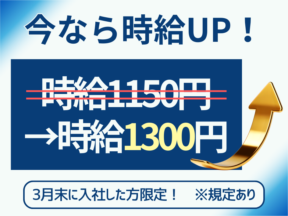 ※入職強化キャンペーン中のため 通常時給1150円に+150円し、 時給1300円にて給与を支給いたします ※残業込みで月収23万円以上可能 |